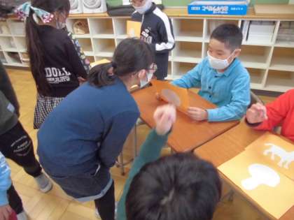 外国語活動では、「What's this?」を使った学習として、自分でクイズを考え、大会を開きました。クイズは、動物や食べ物のシルエットや、足跡や漢字を見て答えを当てるものです。