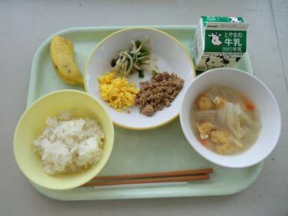 今日の献立は、「牛乳、むぎごはん、二色丼(ぶたそぼろ、いりたまご)、おひたし、みそしる、バナナ」です。