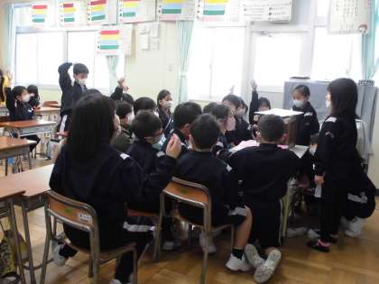 絵本係が読み聞かせをしました。その後、絵本に出てくるクイズを行っている様子です。本の内容を真剣に聞いて、物語を楽しむことができました。