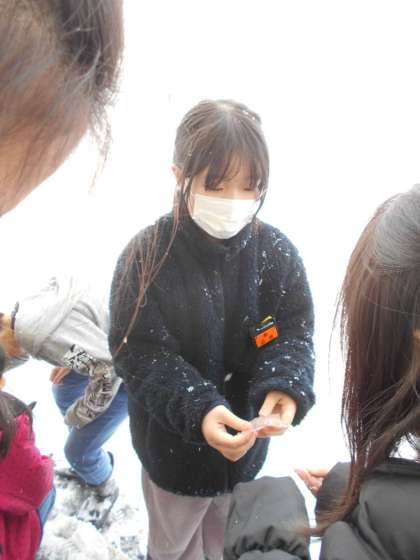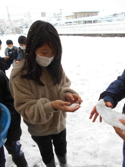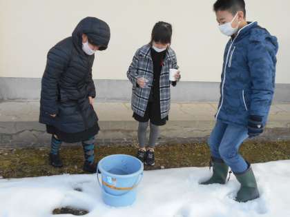 水の姿について学習しています。冷凍庫を使わずに、どうすれば氷ができるのかを考えました。外に水を入れたバケツを置き、毎朝観察に行きました。バケツの縁に氷ができている様子を見て、感動している子供たちの様子です。