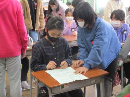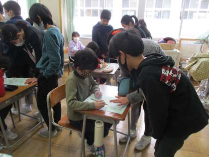 6年生さんにプレゼントするメッセージカードを書いてもらうために、各学年の教室をまわっています。5年生の子供たちは、すてきなプレゼントになるよう、下級生に丁寧に説明していました。