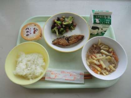 「牛乳、ごはん、魚のあまみそかけ、ビーンズサラダ、春雨スープ、チョコプリン」