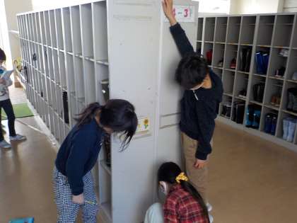自分たちで作った3mものさしを使って、校内の物の長さを測りました。