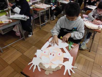 顔の表情や上半身の動きを工夫して、紙版画にチャレンジしています。ポーズも決まり、仕上がりが近づいています。