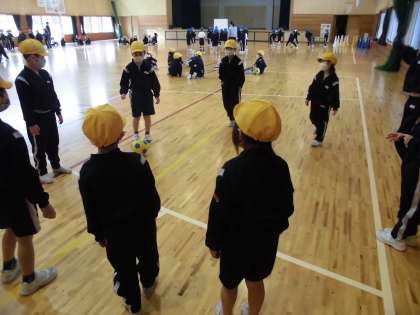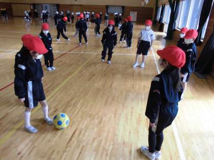 今日からボールけり運動に挑戦しています。今日は色団ごとに、ボールを蹴る、止めるの2つを練習しました。仲間に声をかけて、パスを上手につなぐことができました。