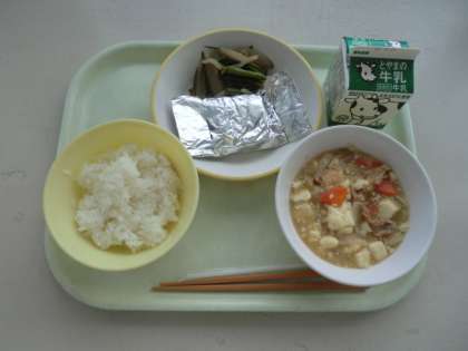 今日の献立は、「牛乳、ごはん、さばの銀紙やき、くきわかめのきんぴら、えびと野菜のうま煮」です。