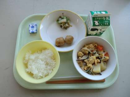 今日の献立は、「牛乳、ごはん、肉だんごのあんからめ、ばいにくあえ、白ねぎと高野どうふのたまごとじ、ポケットチーズ」です。
