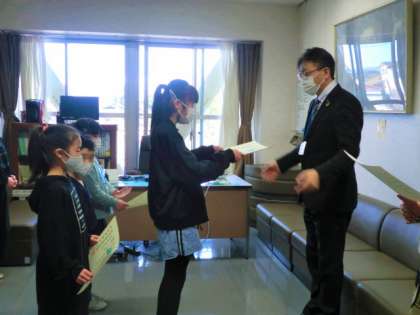 「富山県小・中・高校生書初大会」で入賞した児童の授賞伝達を行いました。今年度は校長室での授賞伝達となりましたが、子供たちは、姿勢良く校長先生から賞状を受け取りました。