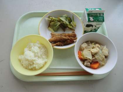 今日の献立は、「牛乳、ごはん、わかさぎのごまだれかけ、くきわかめサラダ、はくさいなべ」です。