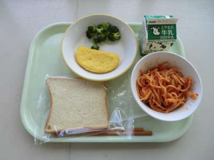 今日の献立は、「牛乳、食パン、えびとトマトのクリームスパゲッティ、オムレツ、ゆでブロッコリー」です。