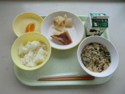 今日の献立は、「牛乳、ごはん、あか魚の塩焼き、かぶのあまずあえ、たまごともずくのスープ、きよみオレンジ」です。