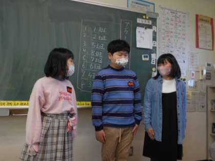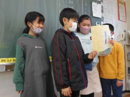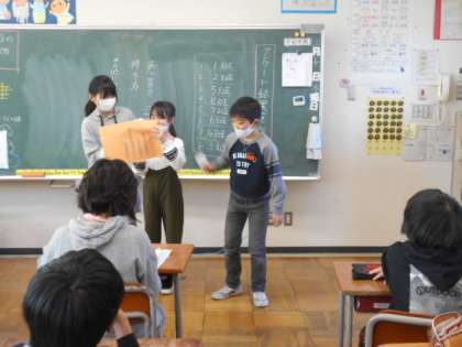 国語科の学習で、クラスのみんなにアンケートをとり、わかったことを発表し合いました。クラスの仲間の好きな遊びや教科などについて、感想やさらに詳しくインタビューした内容などをまとめ、伝えました。子供たちの様子です。