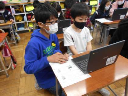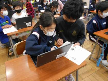 今日は、1年生が初めて一人一人に与えられたPC端末を扱う日ということで、6年生が補助をしに行きました。キーボード入力の補助や、クラスルームに入り、課題に取り組む手順、PCの電源の切り方などを教えました。久しぶりに1年生とゆっくりふれあい、「癒やされた」と語る子供もおり、とても楽しいひとときを過ごせたようでした。