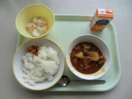 今日の献立は、「オレンジジュース、ごはん、カレーライス、ふくしんづけ、フルーツヨーグルト」です。