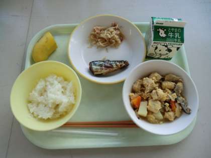 今日の献立は、「牛乳、ごはん、さんまのマーマレード煮、きりぼし大根のオイスターソースいため、たまごとじ、バナナ」です。