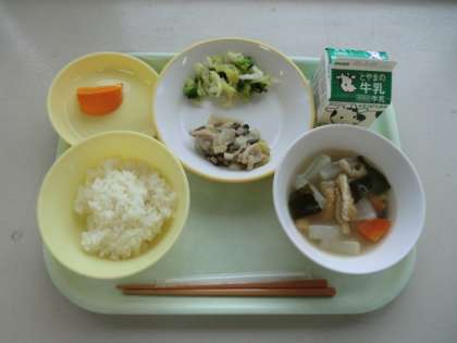 今日の献立は、「牛乳、ごはん、豚肉の塩こうじいため、そえ野菜、ごもくみそしる、せとか」です。
