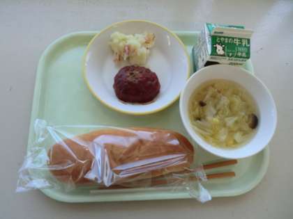 今日の献立は、「牛乳、コッペパン、ハンバーグのケチャップ味、ジャーマンポテト、キャベツスープ」です。