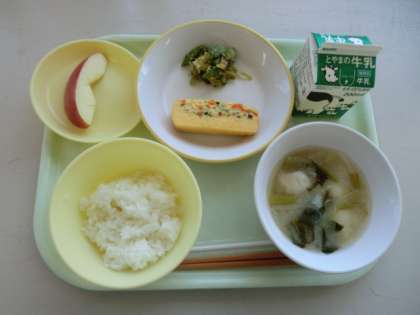 今日の献立は、「牛乳、ごはん、ちぐさやき、アスパラのごまだれ、つみれじる、りんご」です。