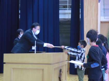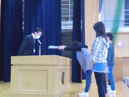 令和2年度の修了式が行われました。各クラスの代表児童が、校長先生から修了証をもらいました。