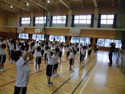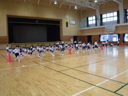 体育科では、間隔を開けて並ぶ練習をしました。その後、みんなで準備運動をしたり走ったりしました。広い体育館を力いっぱい走る子供たち。明日は、晴れたらグラウンドで走る予定です。