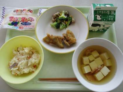 今日は入学お祝い献立です。今日の献立は、ちらしずし、鶏肉の米粉揚げ、ビーンズサラダ、すましじる、クレープ、牛乳です。