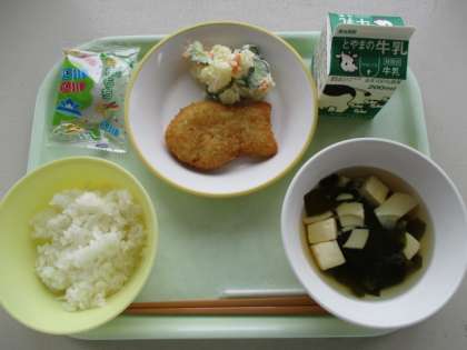 今日は「こどもの日」の献立です。今日の献立は、ご飯、お魚カツ、ポテトサラダ、わかたけ汁、かしわ餅、牛乳です。