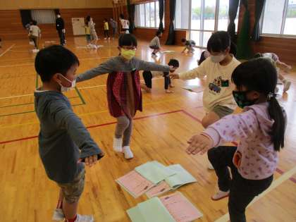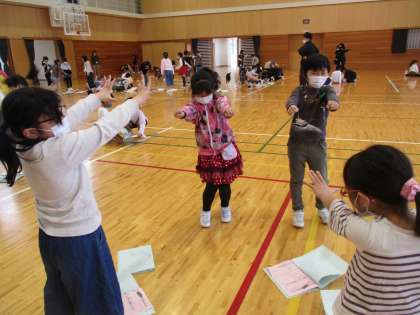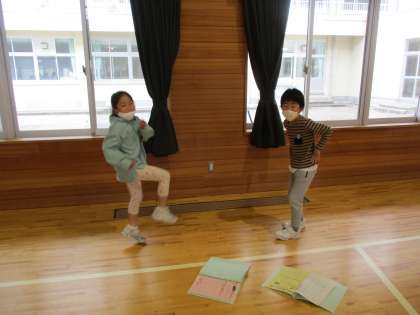 雨の日は室内でパワーアップトレーニングをします。2年生はグループやペアで励まし合いながらがんばっています。