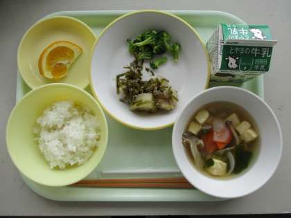 今日の献立は、豚肉と昆布のあまから煮、ゆでブロッコリー、中華スープ、甘夏みかん、ご飯、牛乳です。