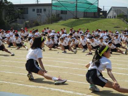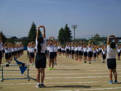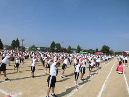 晴れわたる空の下、運動会を行いました。開閉開式と準備運動、応援合戦は全校で行いましたが、各学年の競技はリモートで応援しました。写真は準備運動「新庄っ子体操」の様子です。