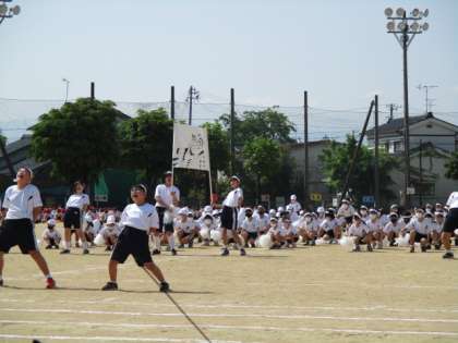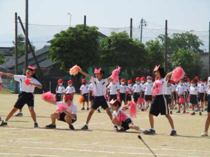 6年生が中心となって行った応援合戦の様子です。どの団も力を出し切って応援をしました。写真は赤団と白団の様子です。