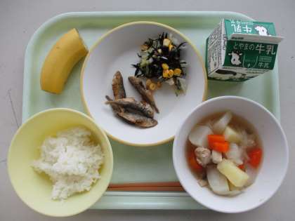 今日の献立は、ひじきのマリネ、子アジの唐揚げ、ポトフ 、ご飯、牛乳、バナナです。