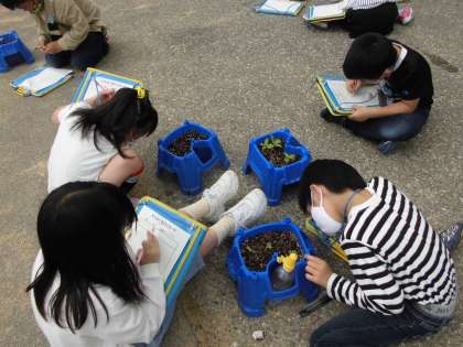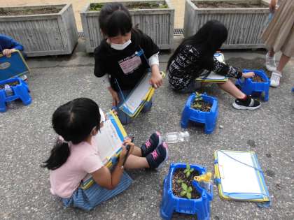 理科の学習で、ホウセンカの観察を行いました。2年生の生活科の時に学んだ観察の仕方を思い出し、葉の大きさや色、茎の高さや色など、いろいろなところに着目して観察していました。子葉と葉の違いに気付き、驚いている様子の子供たちでした。