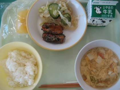 今日の献立は、ちくわの南部揚げ、はるさめサラダ、かき玉汁、ごはん、牛乳、冷凍りんごです。
