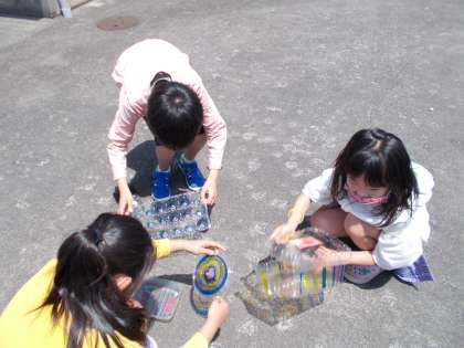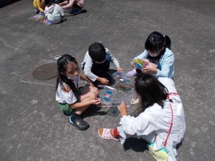 図画工作科では、透明なパックに思い思いの色を付け、光に当てて輝く様子を楽しみました。