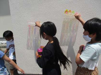 図画工作科では、透明なパックに思い思いの色を付け、光に当てて輝く様子を楽しみました。