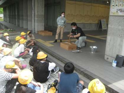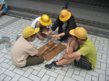 午後から行った火おこし体験の様子です。班で協力して活動していました。古代人の苦労が身にしみて分かったようです。