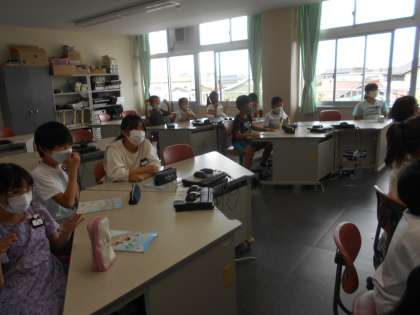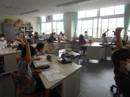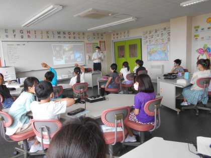 外国語活動では、ALTの方と一緒に学習しています。3年生で学習した好きな物の聞き方を使って、先生に尋ねている子供もいました。