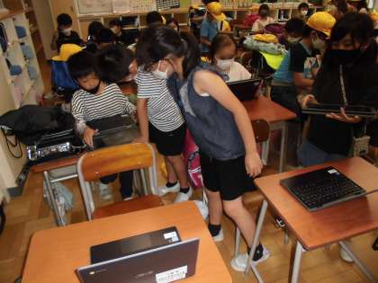 自分のクロームブックを使い、カメラ機能を利用して写真を撮ったり、撮った写真を編集したりする活動に取り組みました。使用方法を一度説明すると、大変飲み込みが早く、すぐに使いこなし、セルフタイマーを用いて撮影してみたり、写真にイラストを加えて楽しい写真にしたりする様子が見られました。