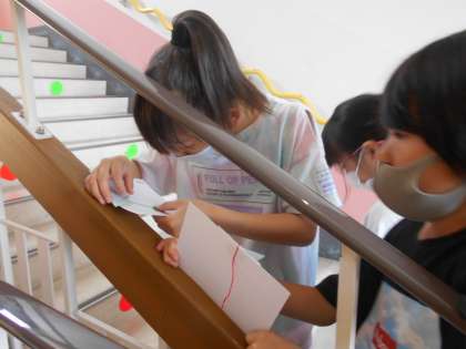 算数科では、角の大きさの学習をしています。身の周りにある、"かたむいているところ”の角度を専用の道具を使ってはかりました。階段の手すりや、スキー山のかたむきが、見当をつけた角度より意外と小さいことにびっくりしていました。