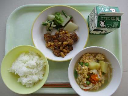 今日の献立は、大豆とホタテのゴマからめ、昆布あえ、卵とじ、ごはん、牛乳です。