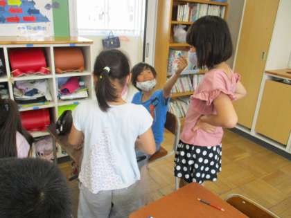 国語の学習で、こそあど言葉について学習しました。普段から何気なく使っているこそあど言葉を、相手に伝わるように使おうと意欲的な子供たちです。「これとって」「あれ見て」とクイズを出し合う子供たちの様子です。