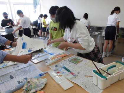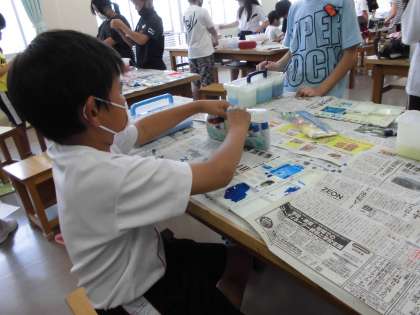 図画工作科では、「心のもよう」を水彩を使って表しました。ただ色を塗るだけではなく、筆の使い方や持ち方を変えるだけで、様々な線を描くことができ、子供たちは自分の思いに合うような表現を探していました。