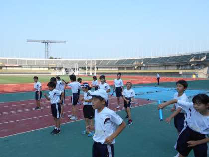 市の陸上大会に参加する子供たちは、毎日練習に励んでいます。今日は、県の陸上競技場で練習を行いました。12日の大会本番に向けて、頑張ってほしいです。