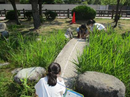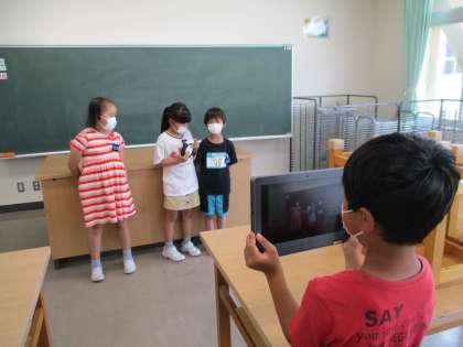 巻き尺を使い、班ごとに学校内にある好きな物の長さを予想し、測る活動を行いました。その後、ほかの班にクイズを出題するため、クロムブックを用い、動画を撮影しました。予想した長さとは大きく違った際には「そんなに長いんだ!」と驚く子供の姿があり、長さの感覚が少しずつ身に付いているようでした。