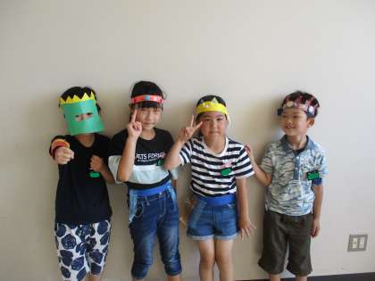 図画工作科で取り組んでいた「わっかでへんしん」が完成しました。思い思いのポーズで記念写真を撮りました。