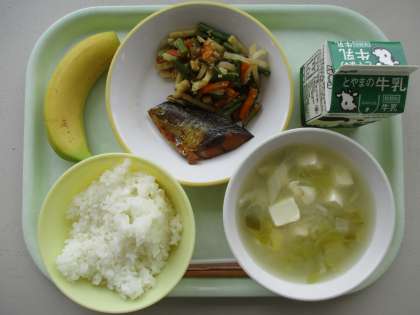 今日の献立は、サバの照り焼き、茎わかめのきんぴら、豆腐の味噌汁、ご飯、牛乳、バナナです。