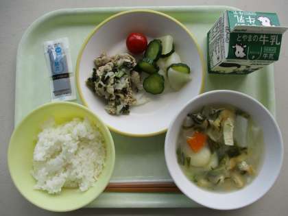 今日の献立は、豚肉の塩麹炒め、かぶのいろどり、ミニトマト、すいとん、海苔の佃煮、ご飯、牛乳です。