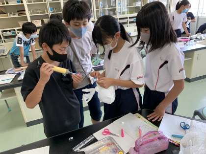 「吸い込む空気とはき出す空気にはどのような違いがあるのだろう」を学習課題に、実験を行いました。気体検知管を使って調べると、人は酸素を吸収し、二酸化炭素を排出していることがはっきりと分かりました。