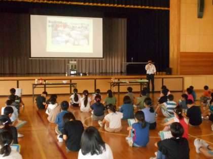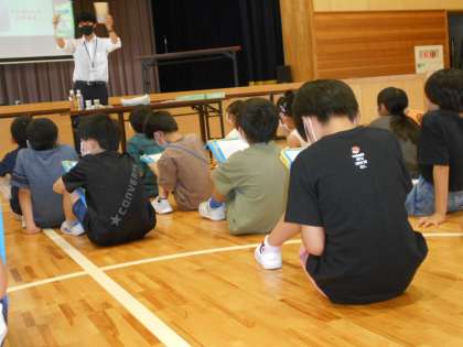 富山市環境センターから4名の講師の方を招いて、3R推進スクールを行いました。3Rや、海洋ゴミについて話しを聞き、ごみ収集車も間近で見ることができ、ごみの問題について考えるきっかけになっていました。