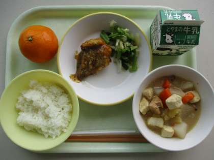 今日の献立は、魚のえごま味噌かけ、小松菜ひたし、鶏肉とじゃがいものごま煮、ご飯、冷凍みかん、牛乳です。